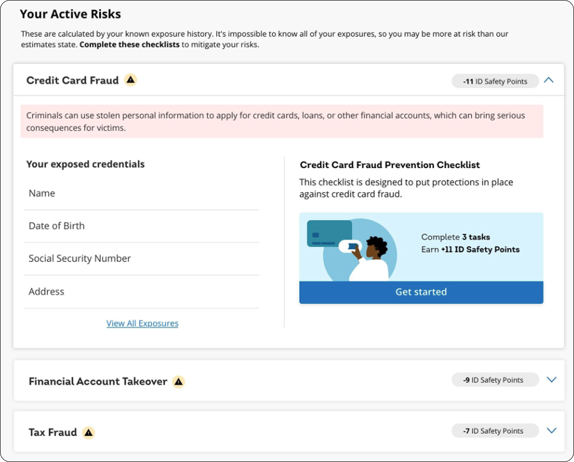 The Solution: I placed the Action Plan on the same page as the ID Safety Score and exposure data, allowing users to reference their risk level and breach history while reviewing recommended actions. Within each risk category, I provided risk descriptions and explanations of which exposed credentials created vulnerability.