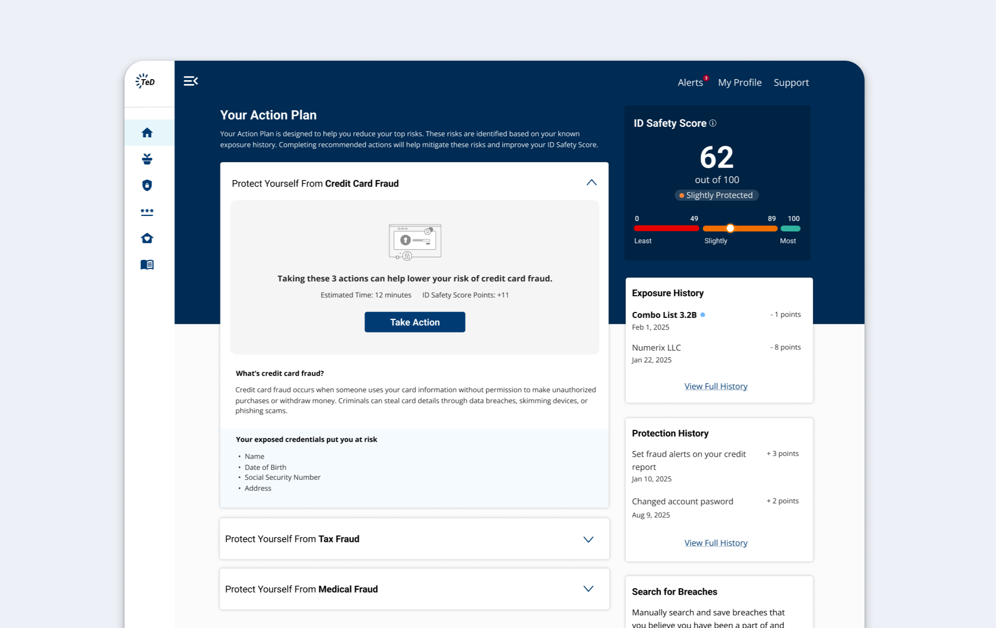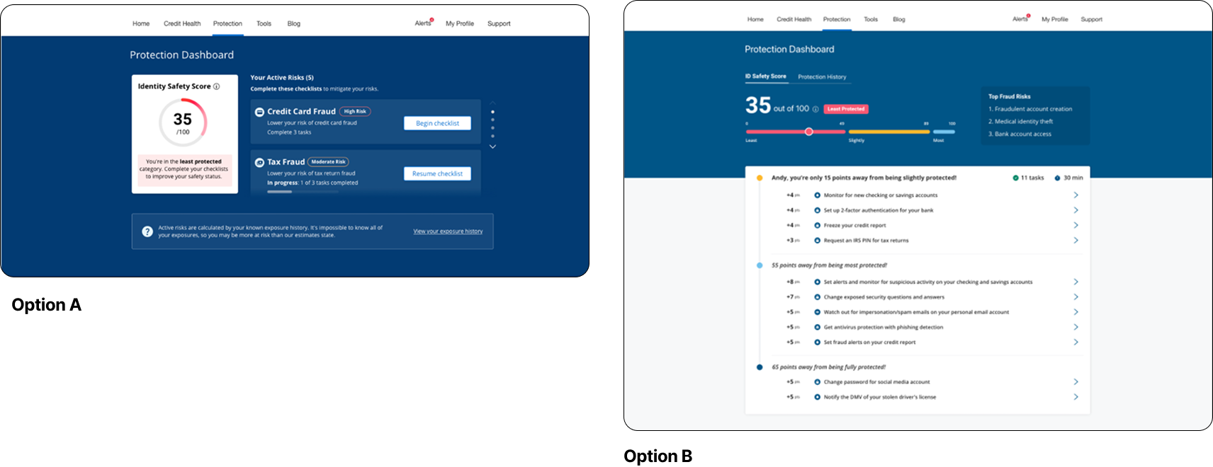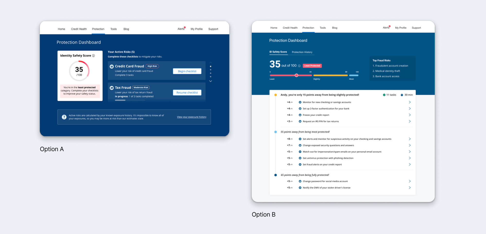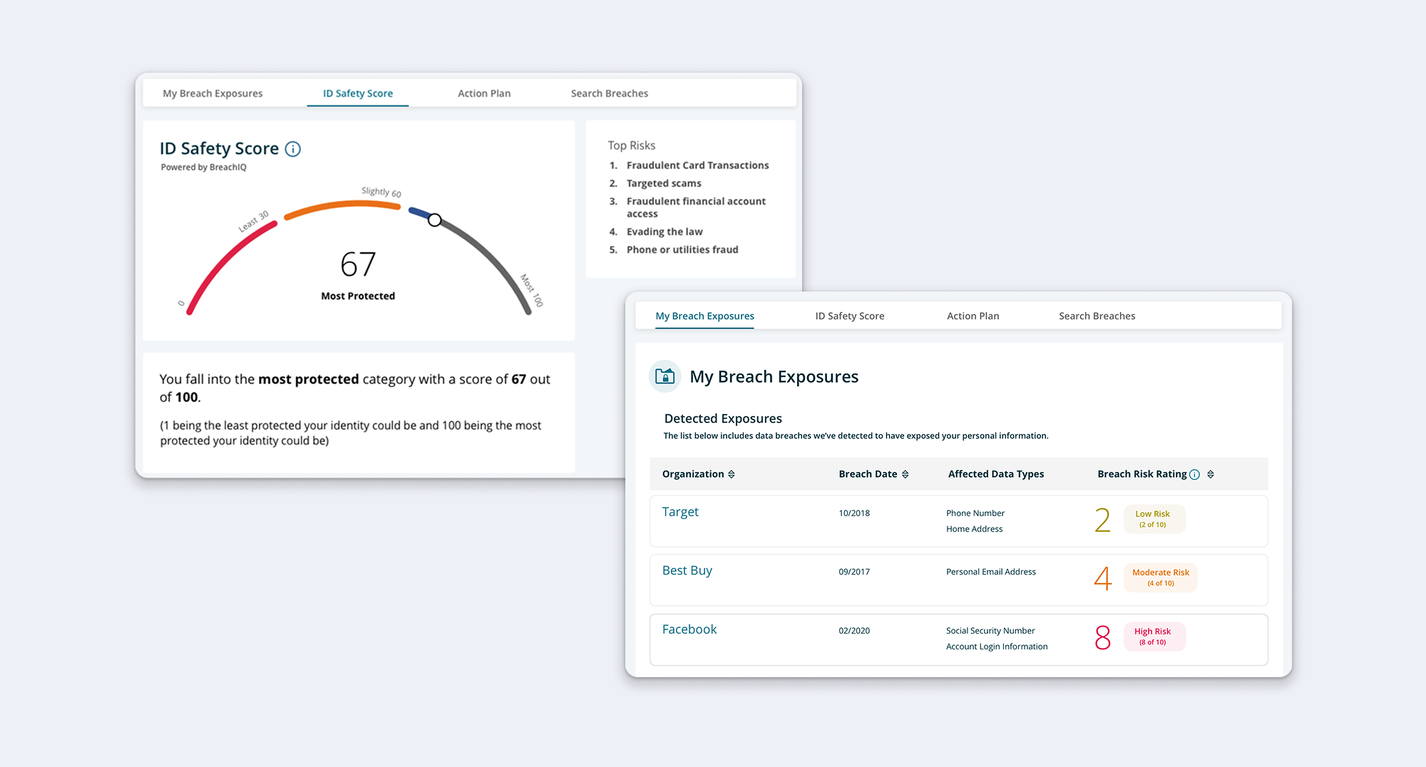 The Approach: I needed to ensure the Action Plan was positioned alongside the context users needed to understand their risks—the ID Safety Score and exposure history. The question was how to structure this information so users could easily move between understanding their risk and taking action.