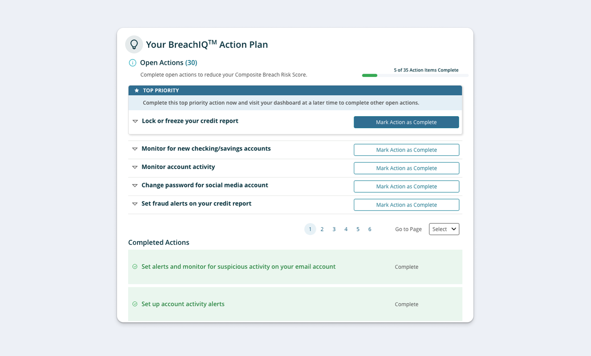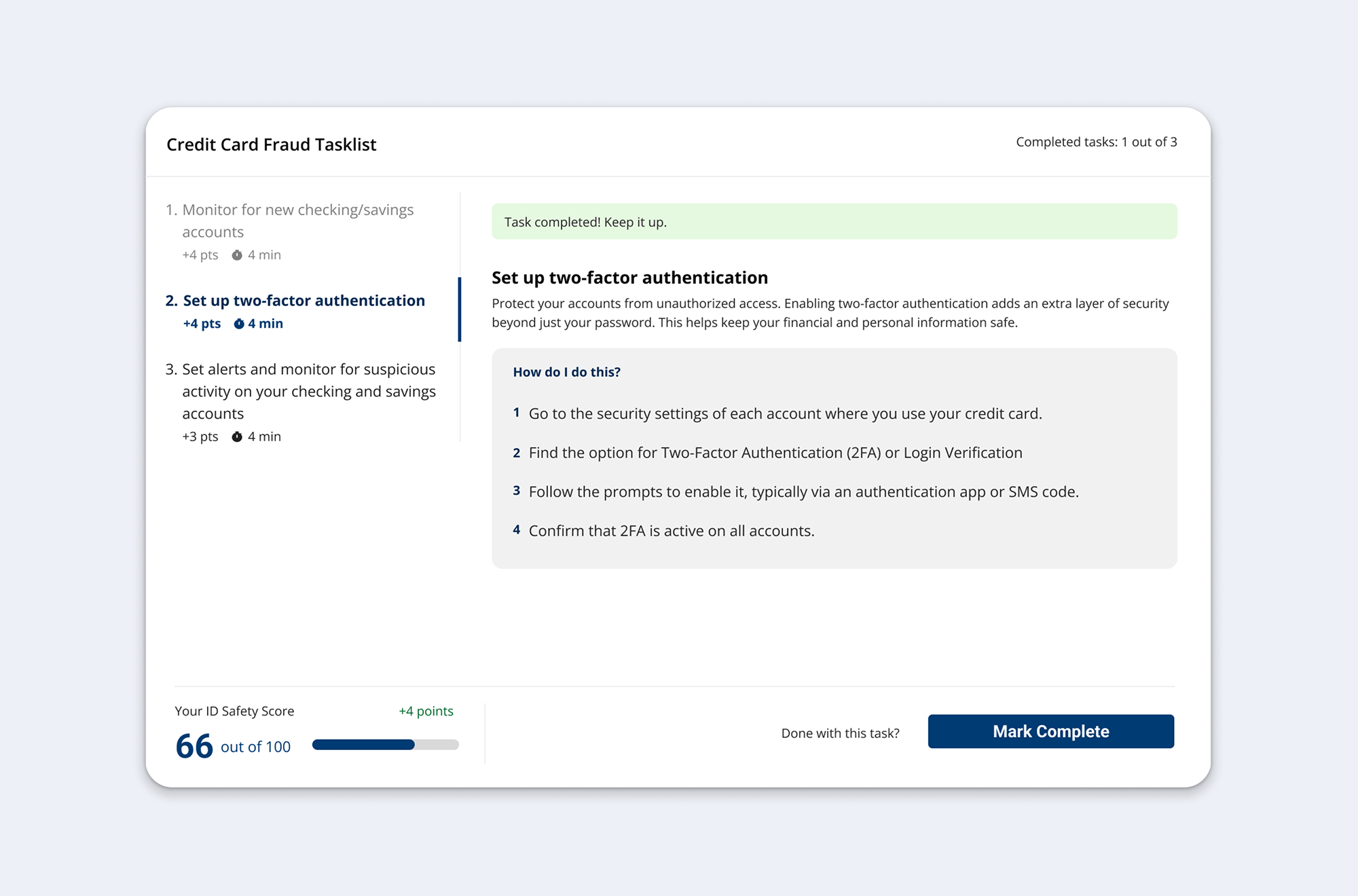 Clicking "Take Action" leads to a focused, distraction-free task view. Users can navigate between tasks via tabs without losing context of which risk they're addressing. The ID Safety Score updates in real-time as tasks are completed, providing immediate feedback on progress.